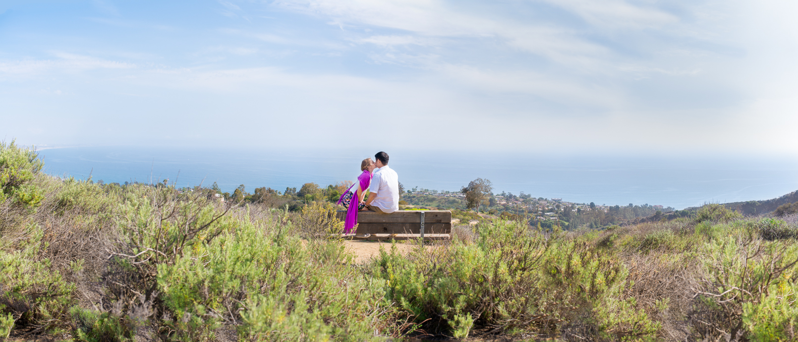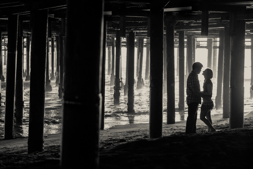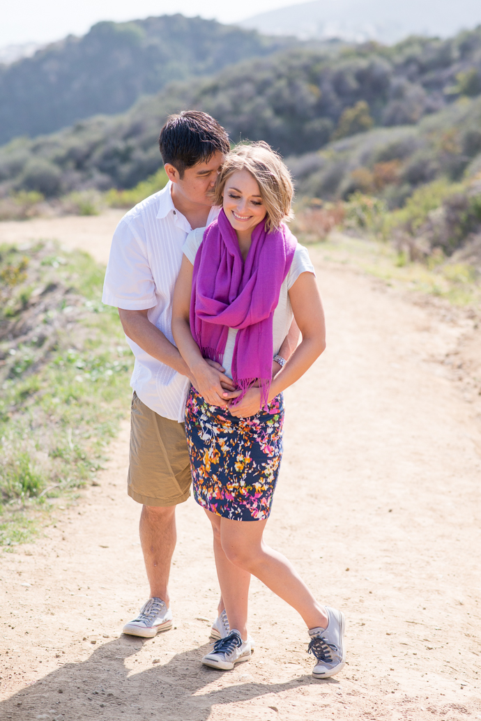 Yeah, it’s good to live in LA. And this is the engagement session that shows off just how awesome it is out here. We got lots of terrific shots from the gorgeous coastal hillsides to the Santa Monica beach, all in one afternoon. Rich had proposed to Erika at this lookout in the Pacific Palisades, so it was perfect to start off their engagement session. All three of us are big hikers, and I was excited one of my couples would be up for a challenge. I could not get over how adorable Erika looked in her outfit, and she hardly broke a sweat. After taking in the panoramic view of the Pacific, we descended to the beach just in time to catch the lovely dusk light. Erika brought along a ukulele Rich had given her. The two of them couldn’t be cuter together!