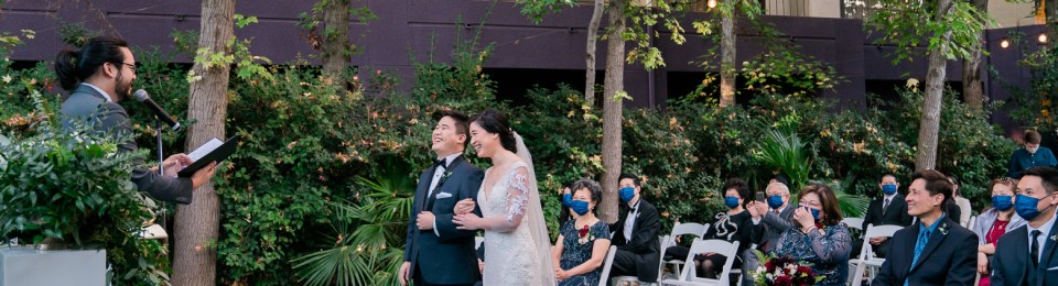 The Avenue of the Arts hotel in Costa Mesa was a perfect backdrop for Fred and Kat’s wedding day. It was inspiring to work with fun textures and colors, like the crushed velvet blue of the couch in the honeymoon suite, and these oversized purple bird cage chairs in the lobby. The colors complimented Kat’s love of midnight blue. Also, check out these towering trees you’d never expect in the middle of Costa Mesa.
