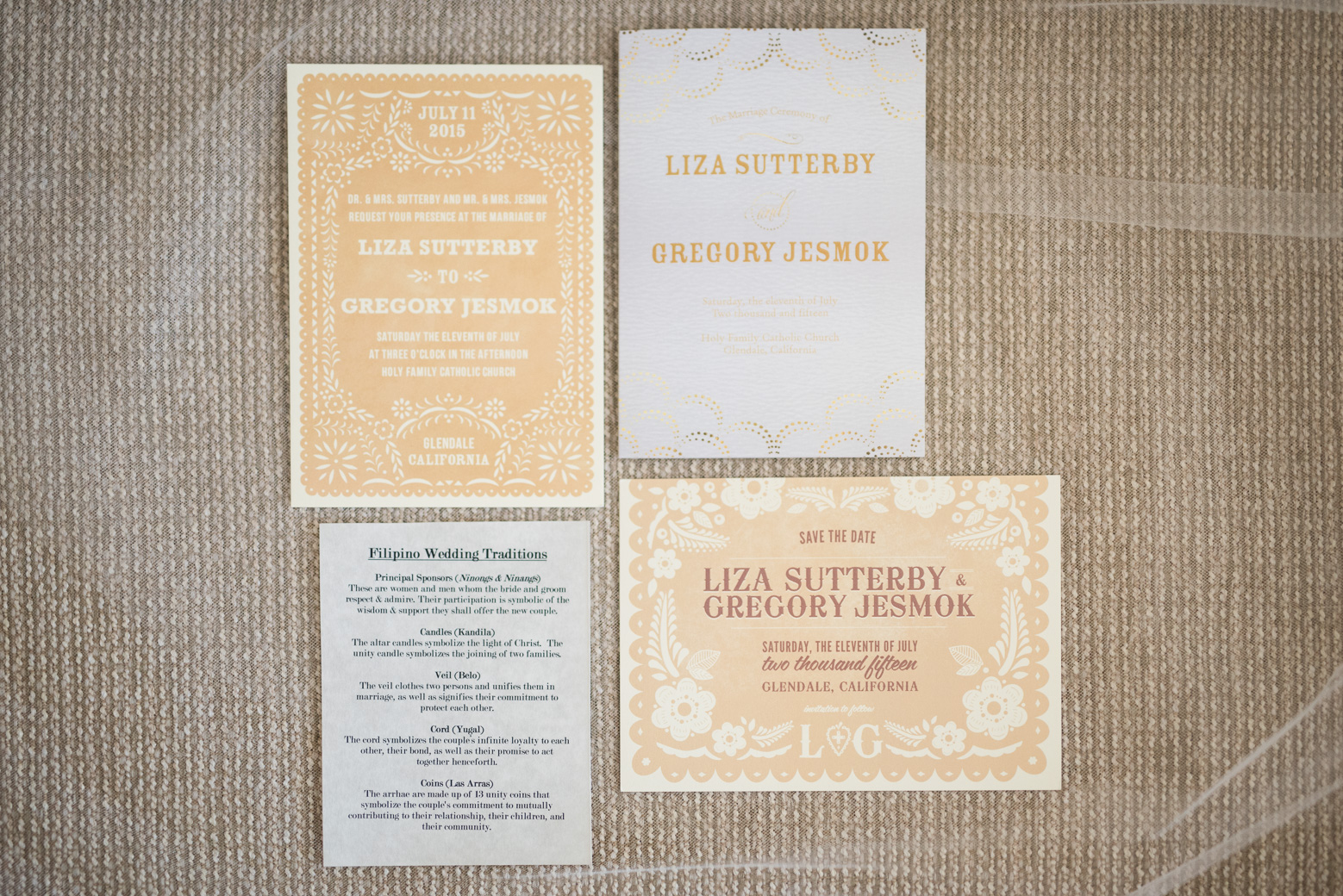 Being based in Los Angeles grants me the opportunity to document so many different kinds of weddings, and I love seeing how couples incorporate cultural traditions into their big day. Liza found the perfect Tadashi Shoji wedding gown to compliment the delicate lacy details that honored her Filipina heritage. Greg’s barong tagalog shirt came custom made, all the way from the Philippines. Tropical flowers, salmon colored place cards, and even a surprise folk dance performance lent an island vibe to this celebration.